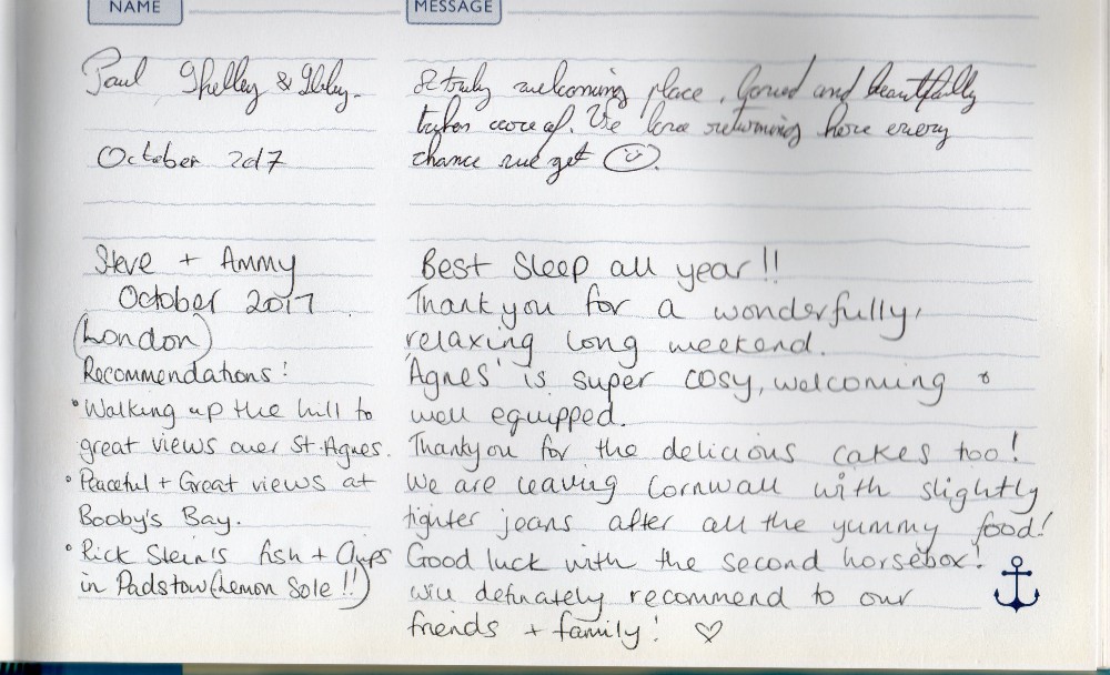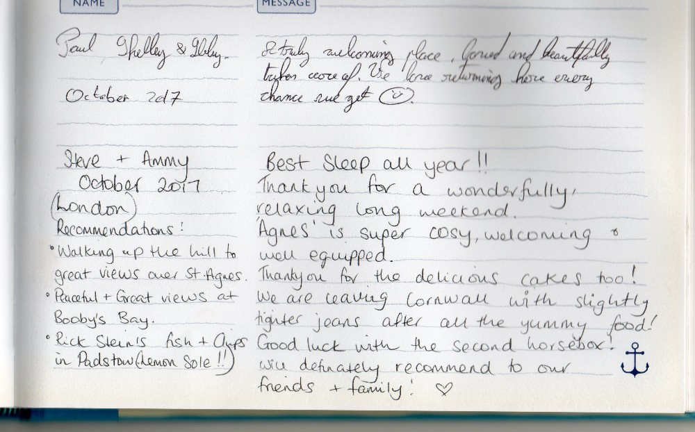 Idyllic. Amongst a tranquil and very private garden nestles Agnes. She was perfect, everything I had hoped for and more. Everything supplied for a relaxing holiday away from day to day stresses. Very welcoming hosts who are on hand if you need them but out of sight so you don't feel overlooked. My favourite holiday to date. So close to all that Cornwall has to offer, quaint Cornish villages, beautiful beaches and breath-taking coastal walks.